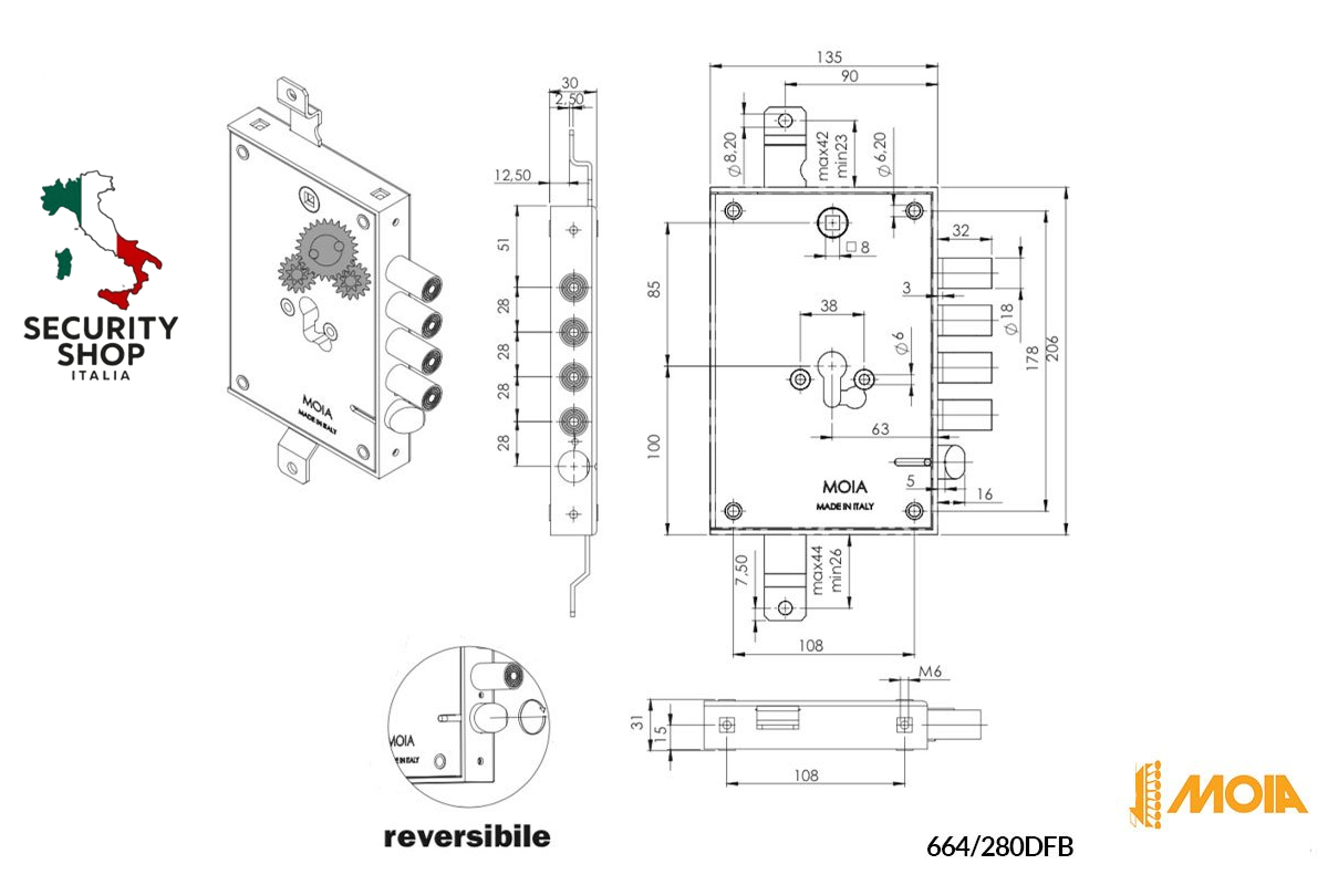 Serratura Profilo Europeo 664/280DFB int.28mm con trappola anti manomissione sistema ad ingranaggi reversibile